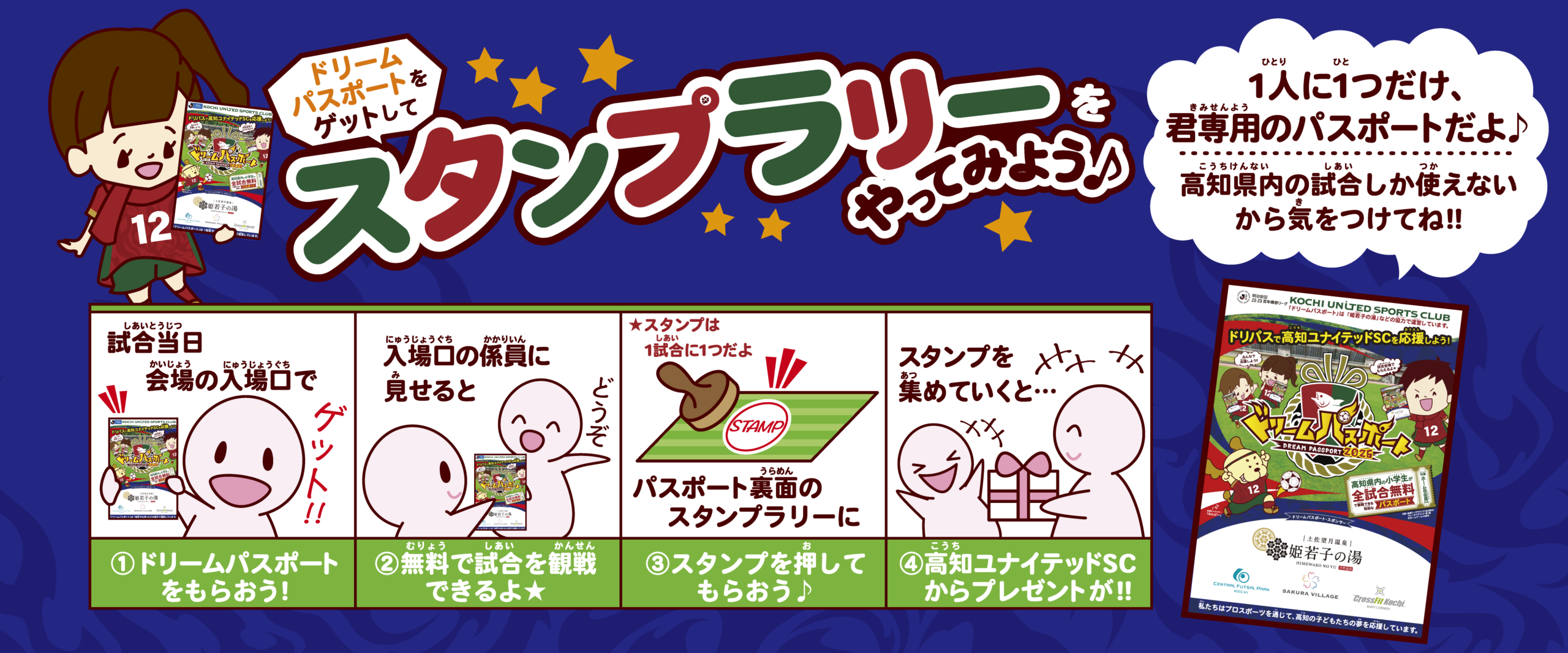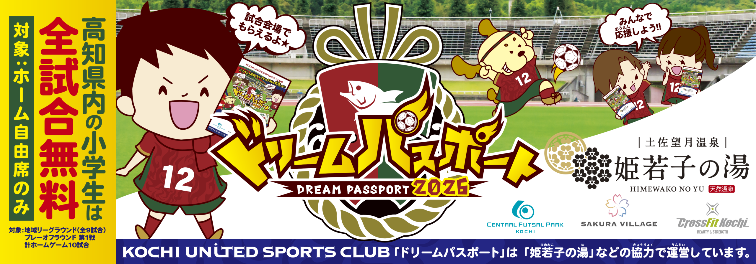 この度、土佐望月温泉 姫和子の湯 様・セントラルフットサルパーク高知 様・さくらヴィレッジ 様・クロスフィット高知 様をはじめとする、セントラルグループ 様のご協力により、高知県内の全ての小学生が「明治安田J2・J3百年構想リーグ」で開催される高知ユナイテッドSCのホームゲーム全試合(計10試合対象)を無料で観戦できる「ドリームパスポート2026」を今シーズンも継続して実施することとなりましたので、お知らせいたします。