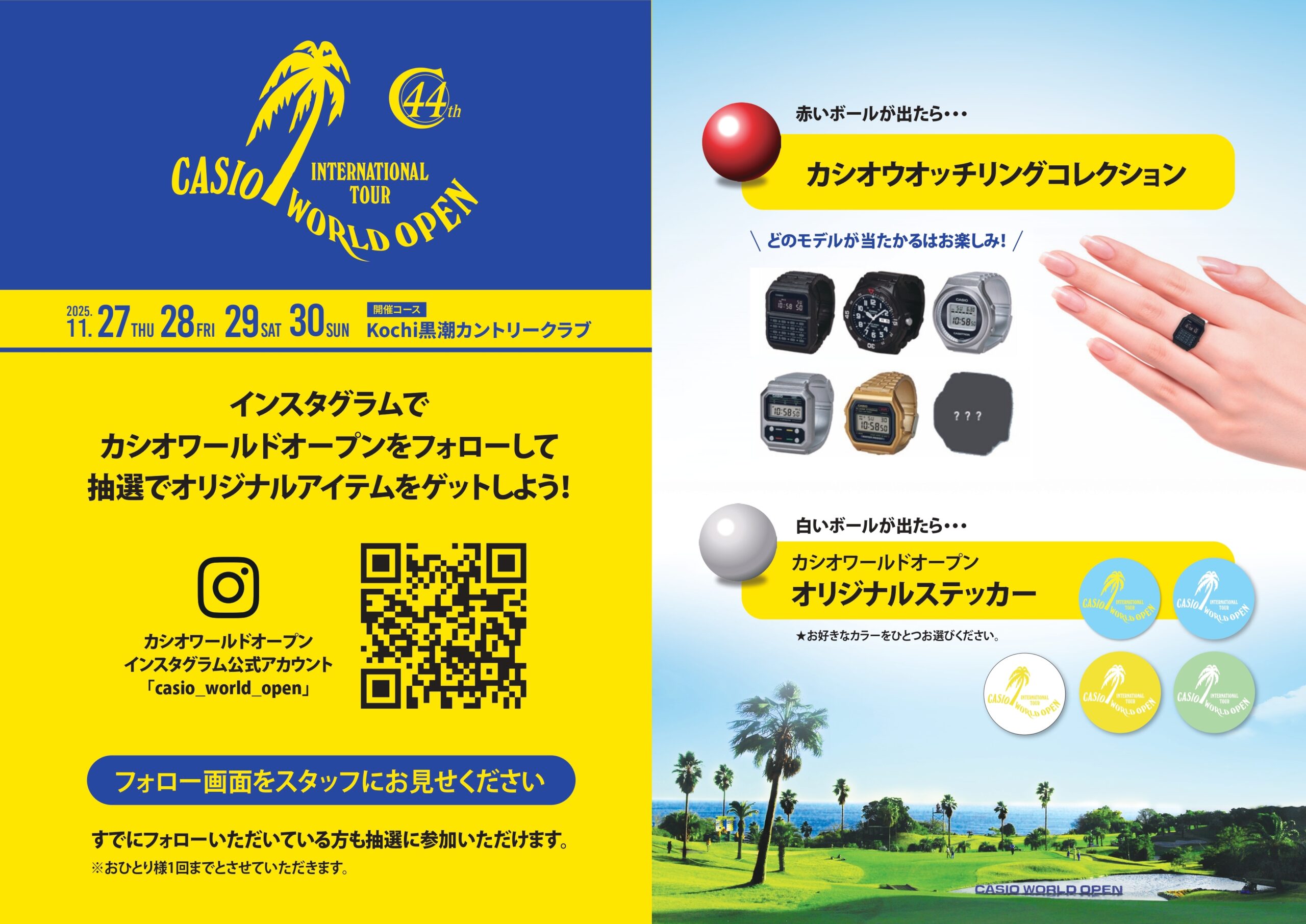 カシオワールドオープン 公式Instagramアカウントをフォローして「カシオウオッチリングコレクション」や「カシオワールドオープン オリジナルステッカー」、「カシオワールドオープンのペア招待券」をGETしよう!