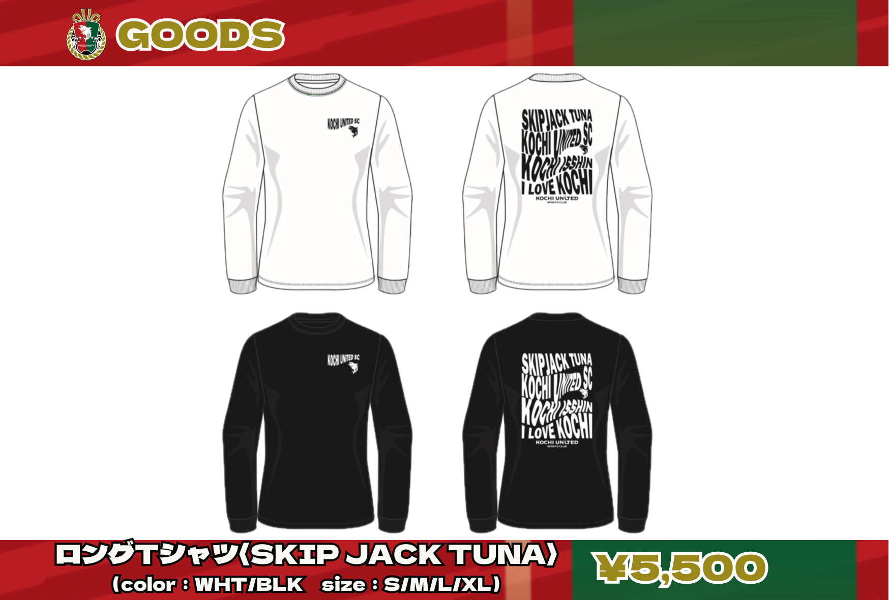 左胸には、クラブ名とカツオがプリントされており、バックプリントには「SKIP JACK TUNA(鰹)」、「KOCHI UNITED SC」、「KOCHI ISSHIN(高知一心)」、「I LOVE KOCHI」の4つのフレーズがプリントされています。