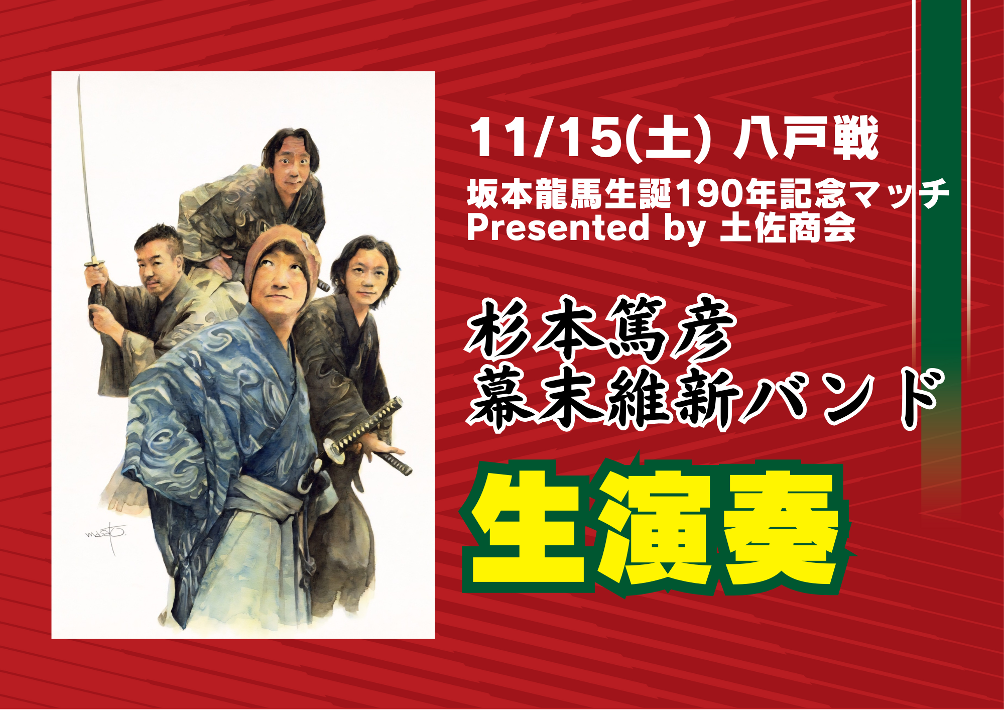 高知県の偉人 坂本龍馬の生誕日である11月15日に開催される冠試合を記念し、試合前に「杉本篤彦 幕末維新バンド」による生演奏を実施!