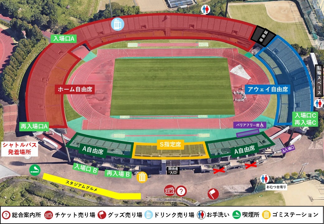 入場口は、入場口A(ホーム自由席)、入場口B(A自由席・S指定席)、入場口C(アウェイ自由席)の3箇所になります。