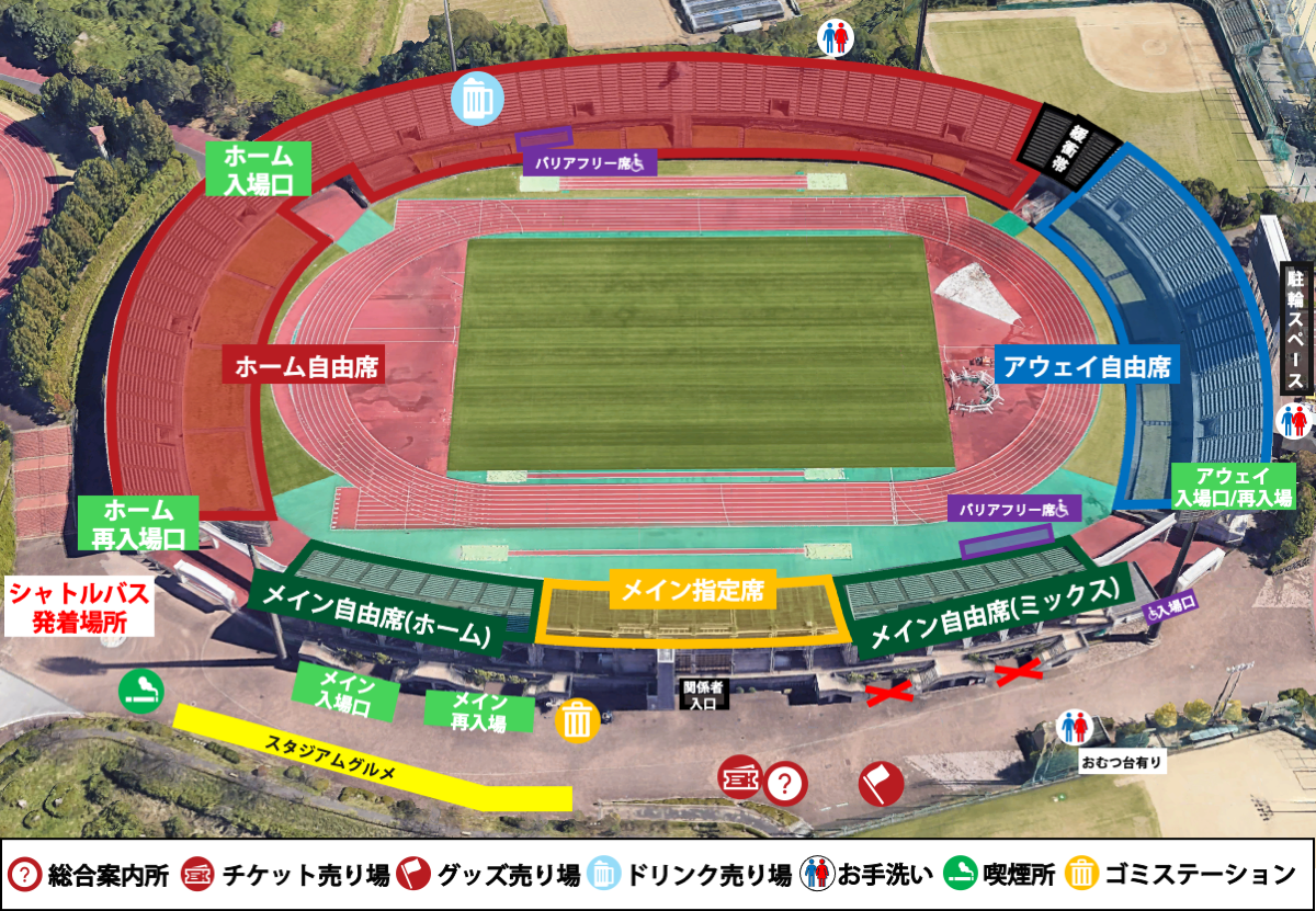 入場口は、ホーム入場口(ホーム自由席)、メイン入場口(メイン自由席・メイン指定席)、アウェイ入場口(アウェイ自由席)の3箇所になります。