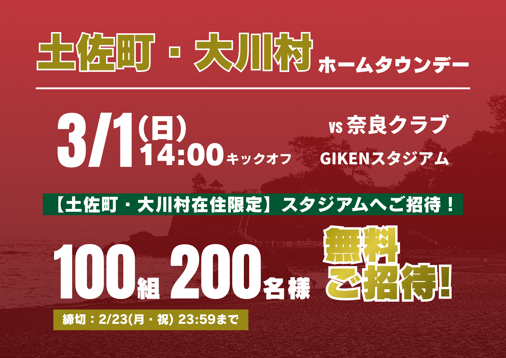3/1(日) 奈良戦では、「土佐町・大川村ホームタウンデー」として、土佐町・大川村在住の皆様を対象に、 100組200名様を無料ご招待いたします。