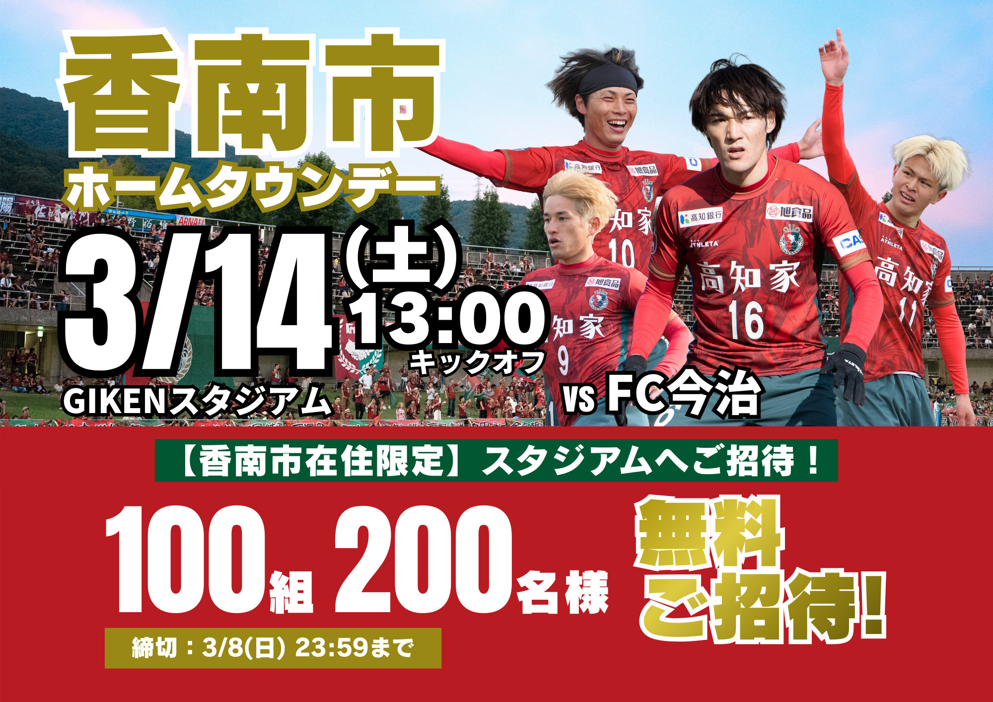 3/14(土) 今治戦では、「香南市ホームタウンデー」として、香南市在住の皆様を対象に、 100組200名様を無料ご招待いたします。