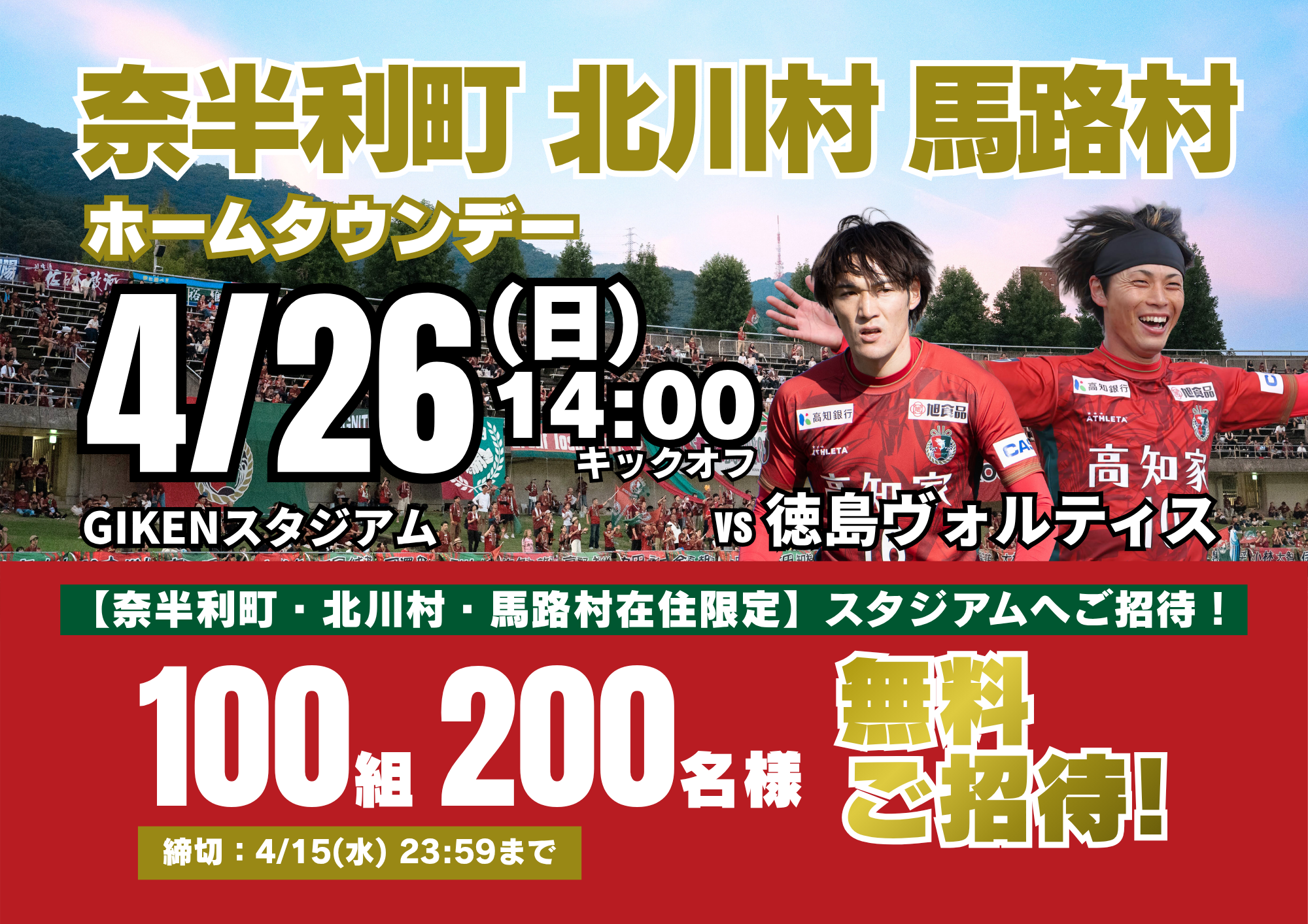 4/26(日) 徳島戦では、「奈半利町・北川村・馬路村ホームタウンデー」として、奈半利町・北川村・馬路村在住の皆様を対象に、 100組200名様を無料ご招待いたします。