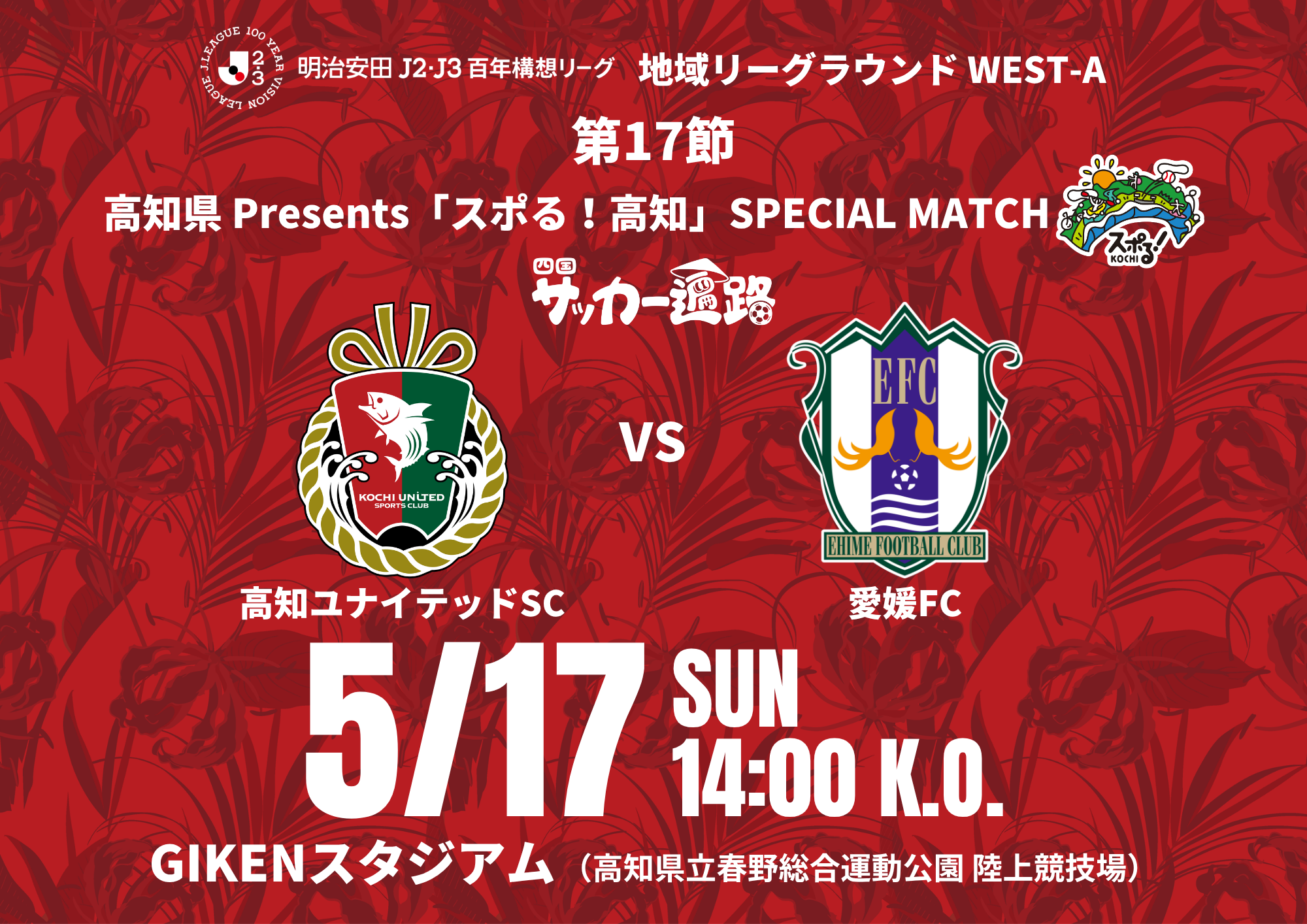 5/17(日)に開催されます「明治安田J2・J3百年構想リーグ 地域リーグラウンド WEST-A 第17節 愛媛FC戦」について、高知県 様の冠試合として開催することとなりましたので、お知らせいたします。
