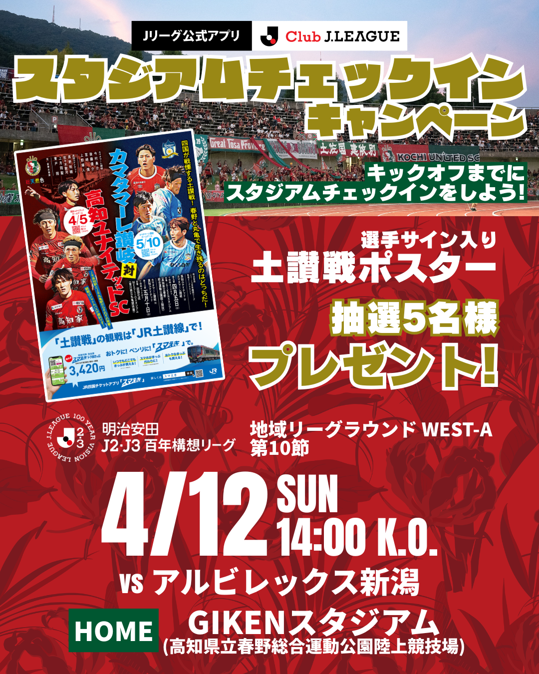 4/12(日)に開催される「明治安田J2・J3百年構想リーグ 地域リーグラウンド WEST-A 第10節 アルビレックス新潟戦」の試合会場にて、Jリーグ公式アプリ「Club J.LEAGUE」を使用した来場者限定の抽選会を実施することとなりましたのでお知らせいたします。