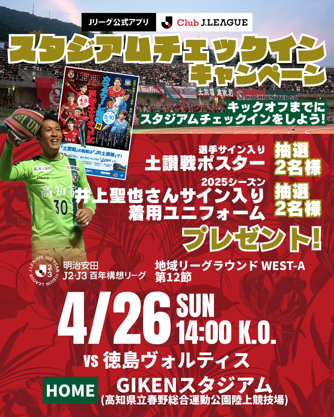 4/26(日)に開催される「明治安田J2・J3百年構想リーグ 地域リーグラウンド WEST-A 第12節 徳島ヴォルティス戦」の試合会場にて、Jリーグ公式アプリ「Club J.LEAGUE」を使用した来場者限定の抽選会を実施することとなりましたのでお知らせいたします。
