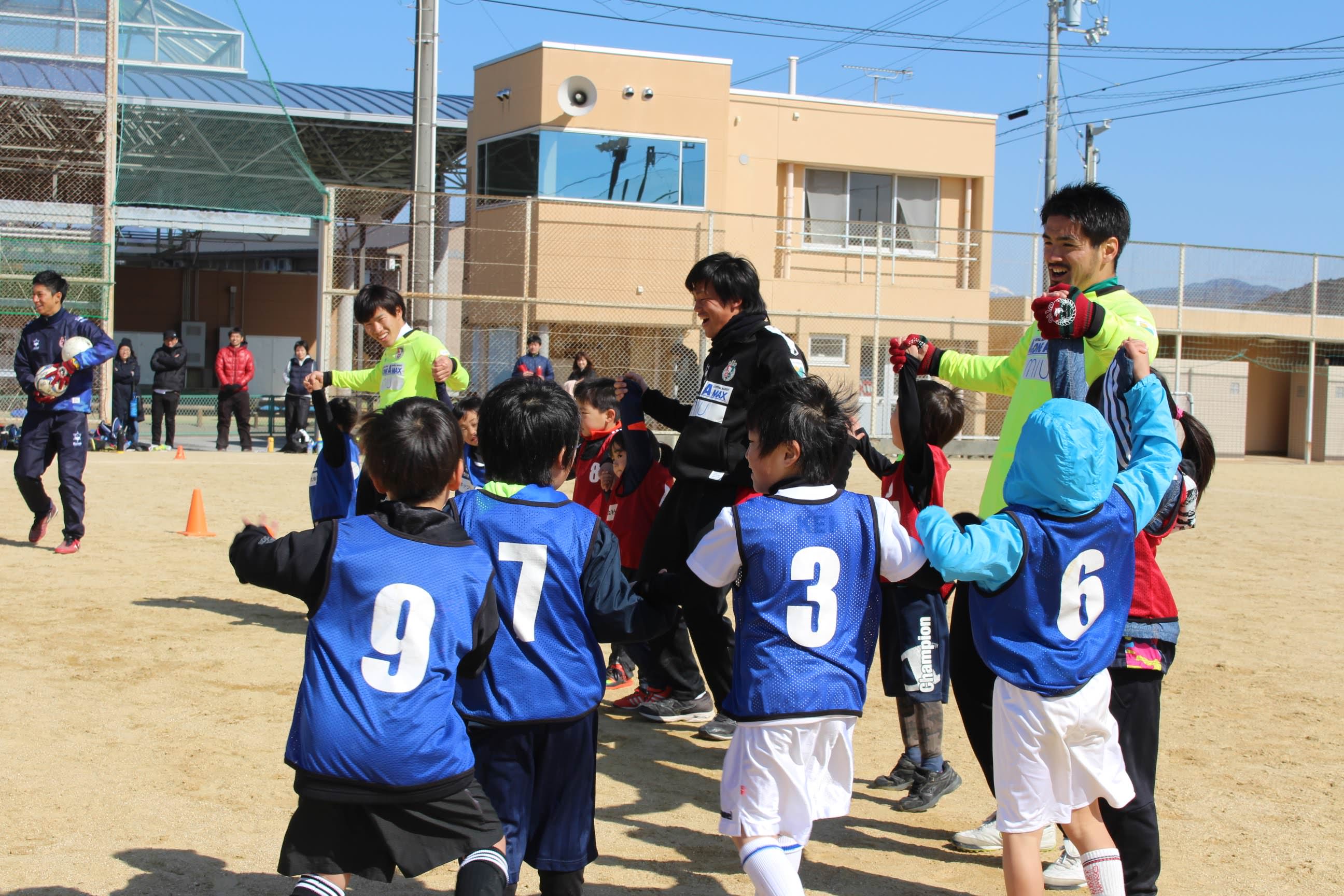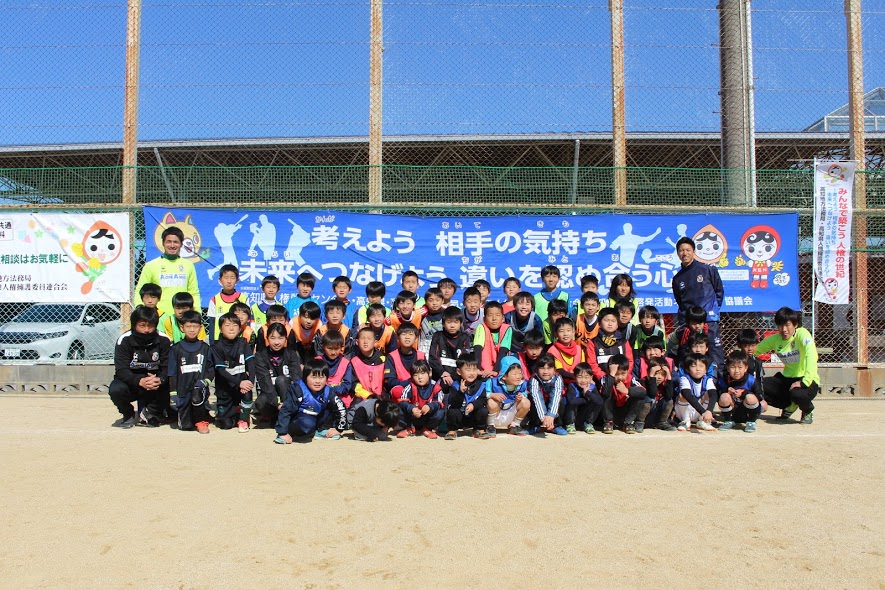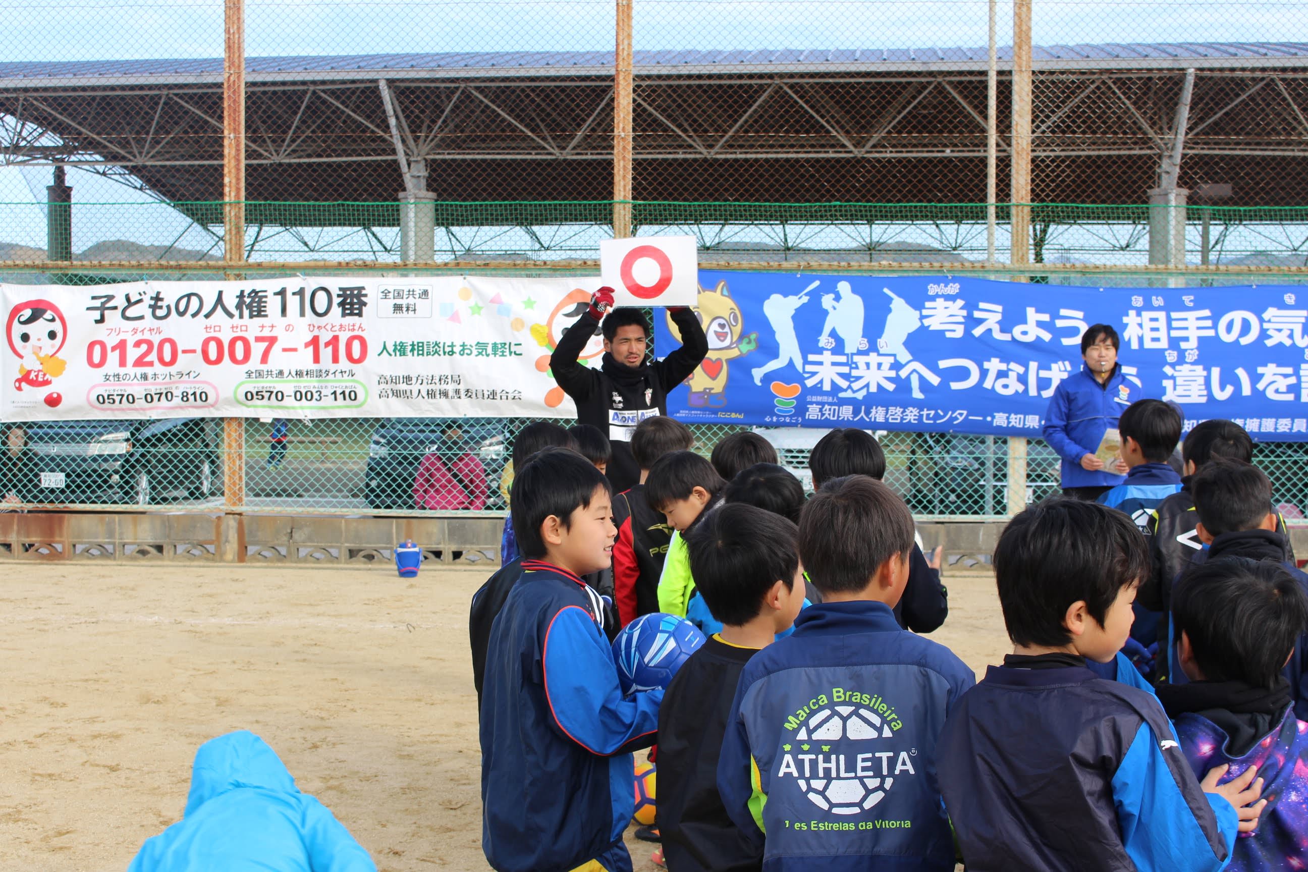 2/18(日)高知県人権啓発センター様主催のサッカー教室を開催し、横竹選手、玉川選手、村上選手とアカデミーから岩﨑コーチ(がんちゃん)、一柳コーチ(いちコーチ)が参加しました。
