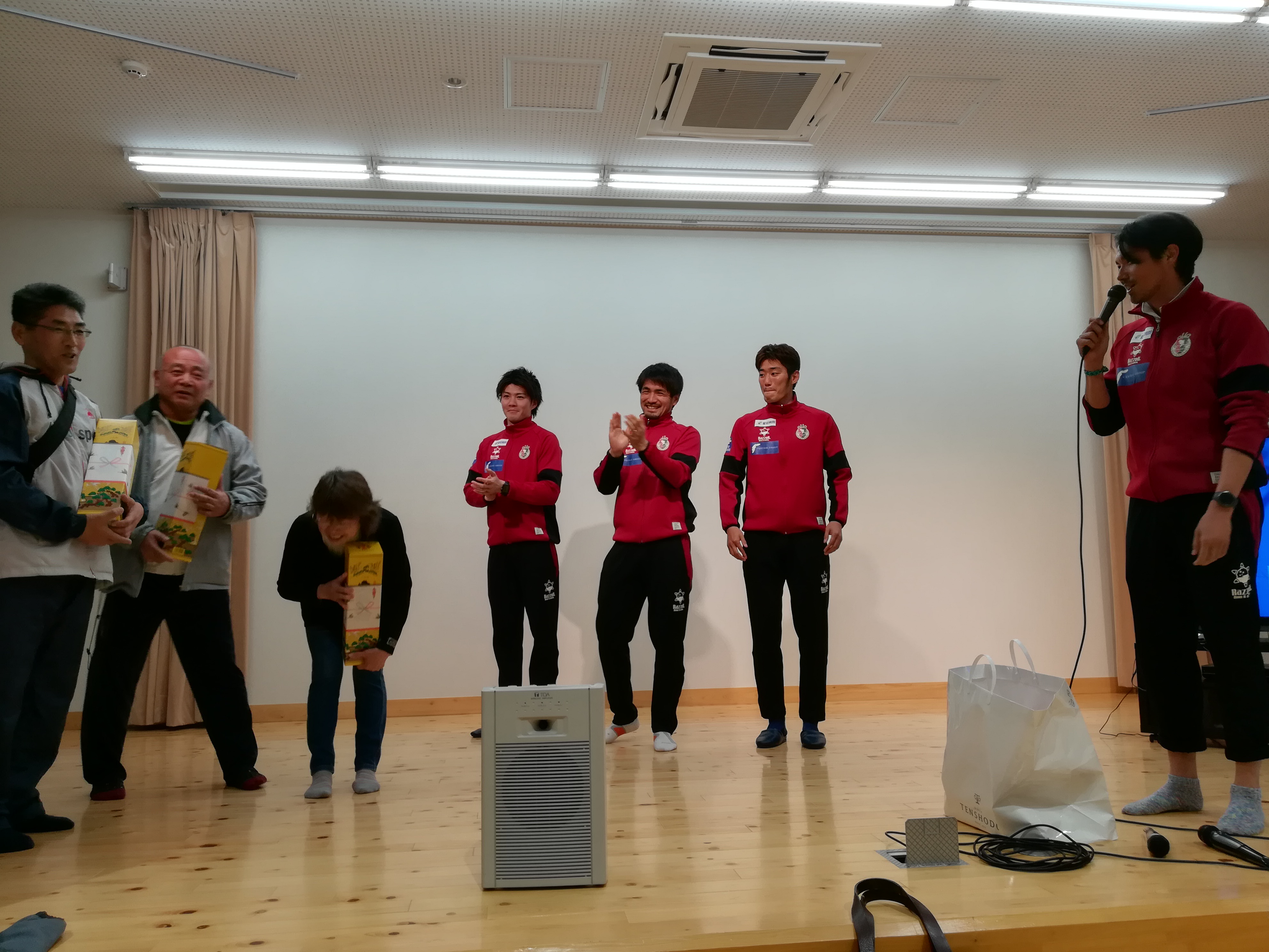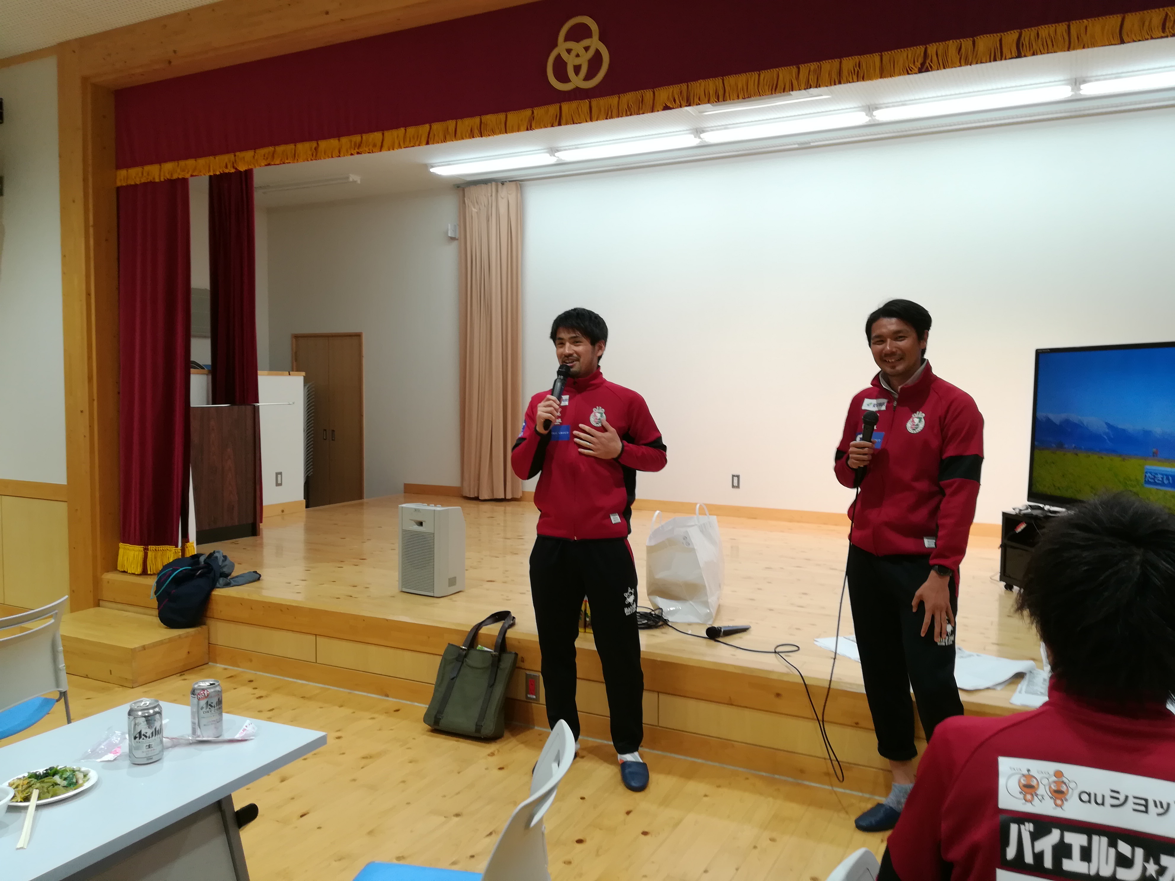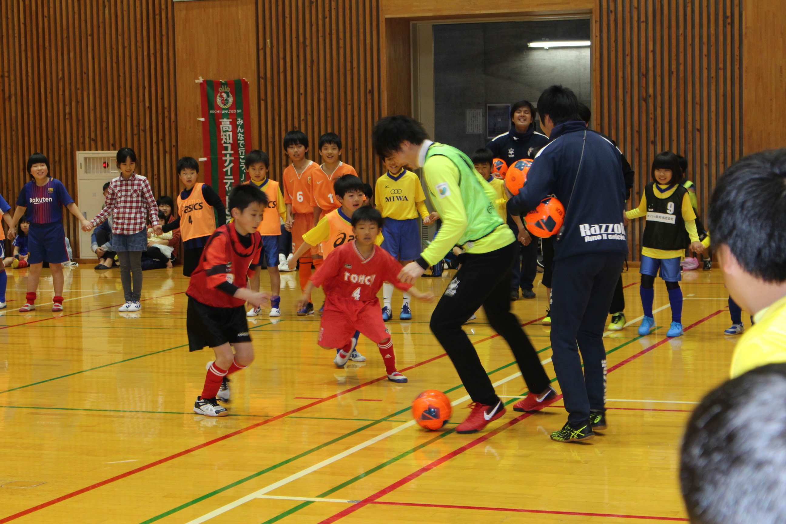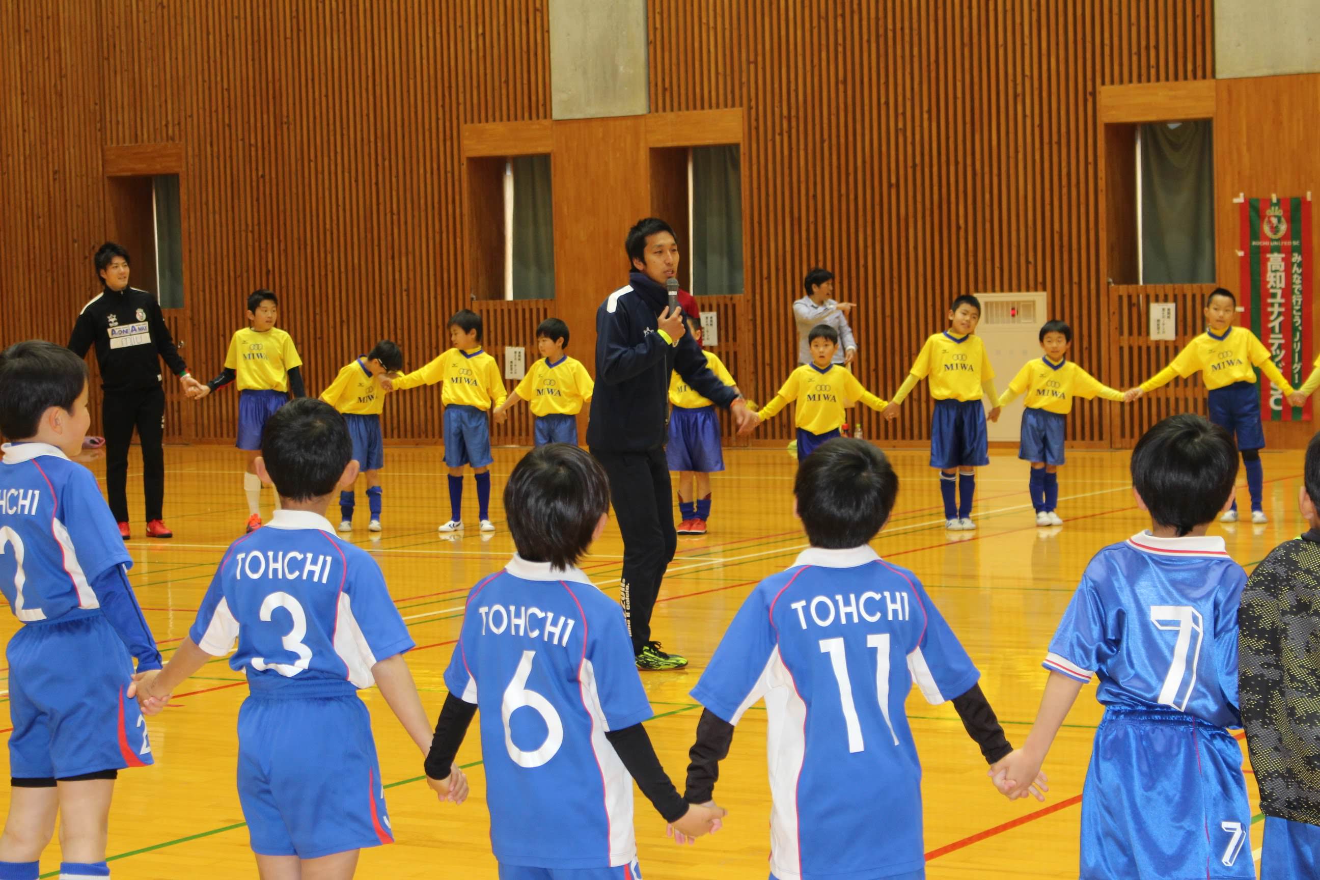 このイベントは地域の方々と高知ユナイテッドSCが交流を深め、一緒に地域を盛り上げげようとはじまり、今回が2回目です。高知ユナイテッドSCからは大谷監督、横竹選手、山内選手、泉選手、船川選手、アカデミーコーチなど11名で参加、地域の方々もサッカー教室の部に100名、教室の後の懇親会に80名と大勢集まってくれました。