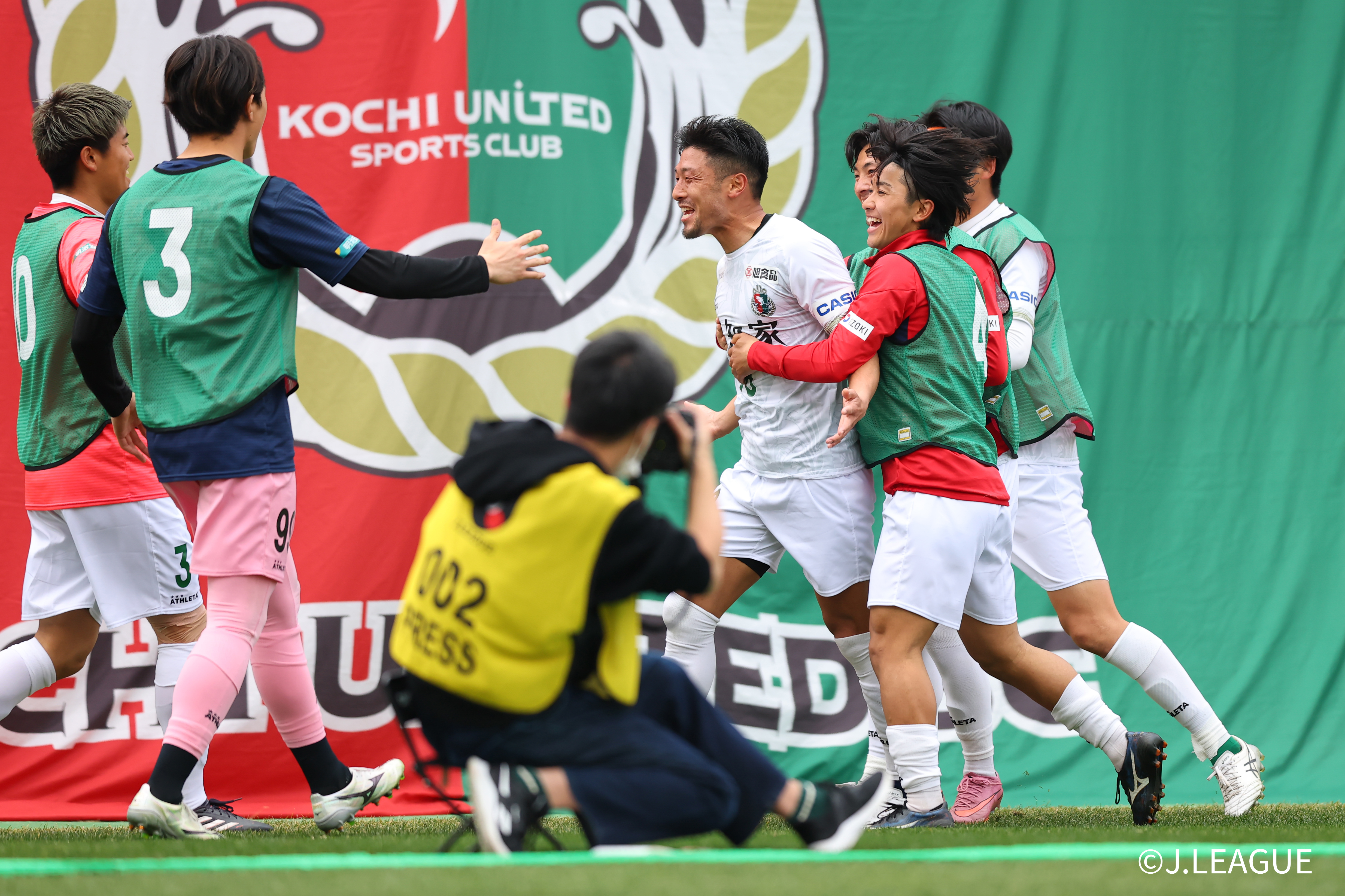 HIGASHIOSAKA, JAPAN – FEBRUARY 15: #88 HAMA Takumi of Kochi United SC celebrates scoring his side’s second goal with his team mates during the J.LEAGUE MEIJI YASUDA J2/J3 100 YEAR VISION LEAGUE 2nd Sec. match between FC Osaka and Kochi United SC at Hanazono Rugby Stadium (Higashiosaka) on February 15, 2026 in Higashiosaka, Osaka, Japan. (Photo by J.LEAGUE/J.LEAGUE via Getty Images)