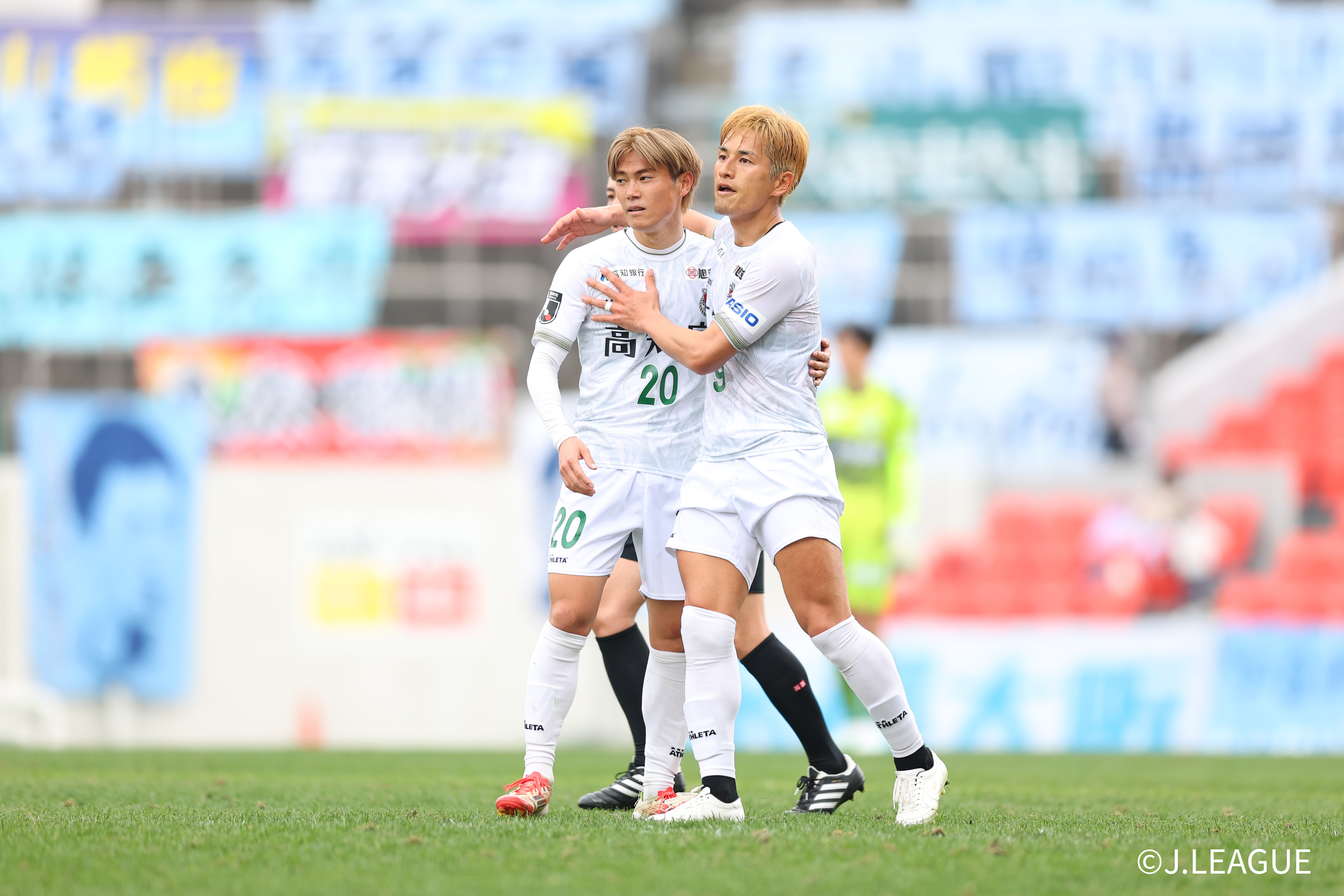 HIGASHIOSAKA, JAPAN – FEBRUARY 15: #20 SUGIYAMA Reo of Kochi United SC celebrates scoring his side’s first goal with his team mates during the J.LEAGUE MEIJI YASUDA J2/J3 100 YEAR VISION LEAGUE 2nd Sec. match between FC Osaka and Kochi United SC at Hanazono Rugby Stadium (Higashiosaka) on February 15, 2026 in Higashiosaka, Osaka, Japan. (Photo by J.LEAGUE/J.LEAGUE via Getty Images)