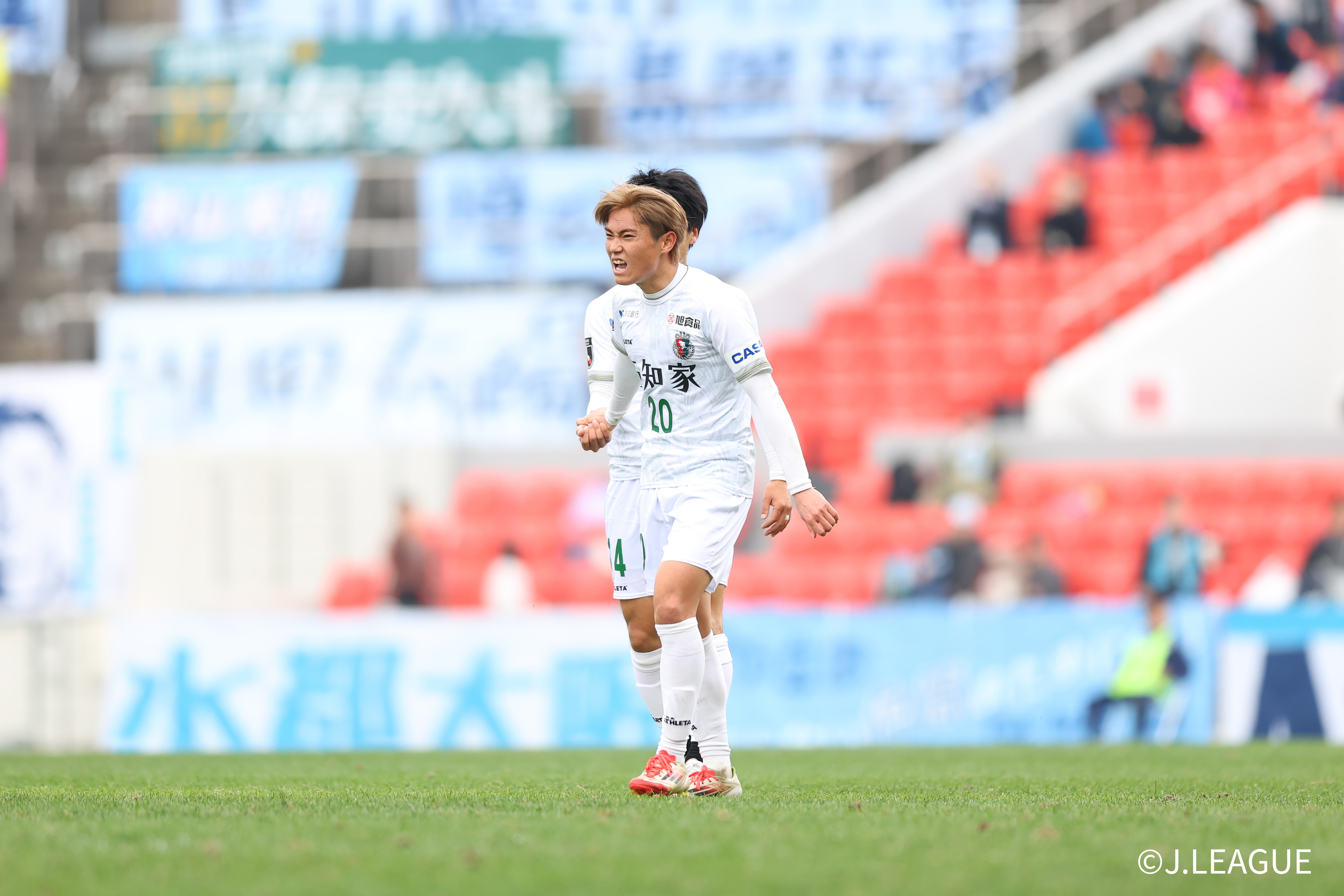 HIGASHIOSAKA, JAPAN – FEBRUARY 15:#20 SUGIYAMA Reo of Kochi United SC celebrates scoring his side’s first goal during the J.LEAGUE MEIJI YASUDA J2/J3 100 YEAR VISION LEAGUE 2nd Sec. match between FC Osaka and Kochi United SC at Hanazono Rugby Stadium (Higashiosaka) on February 15, 2026 in Higashiosaka, Osaka, Japan. (Photo by J.LEAGUE/J.LEAGUE via Getty Images)